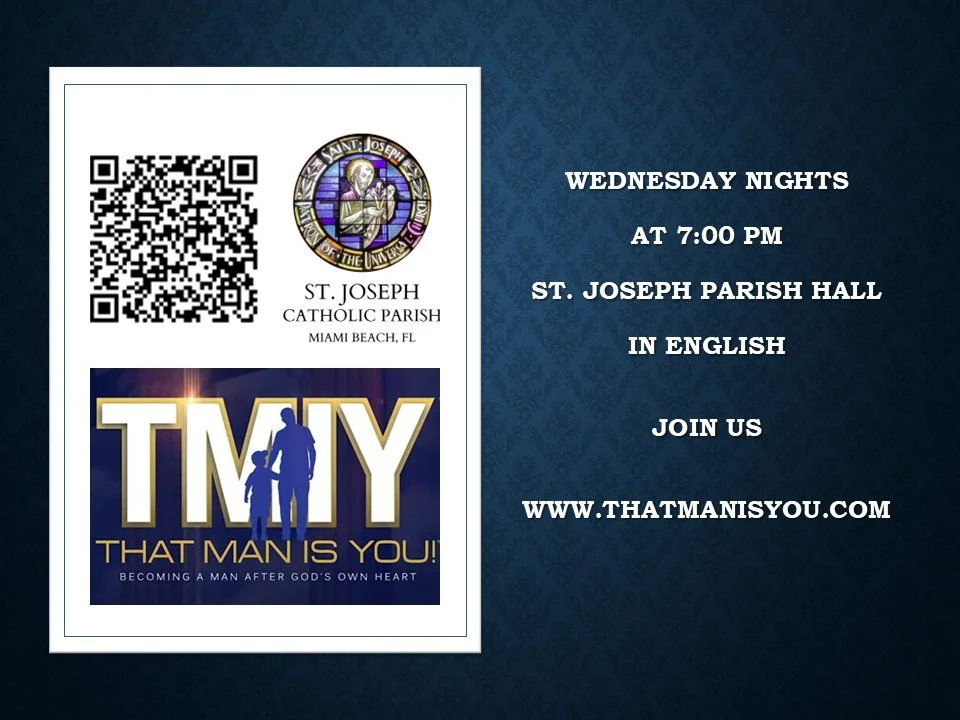 come join us for That Man Is You! (TMIY)—a weekly gathering for men who want to grow in faith, become better husbands, fathers, and brothers, and deepen their relationship with God.