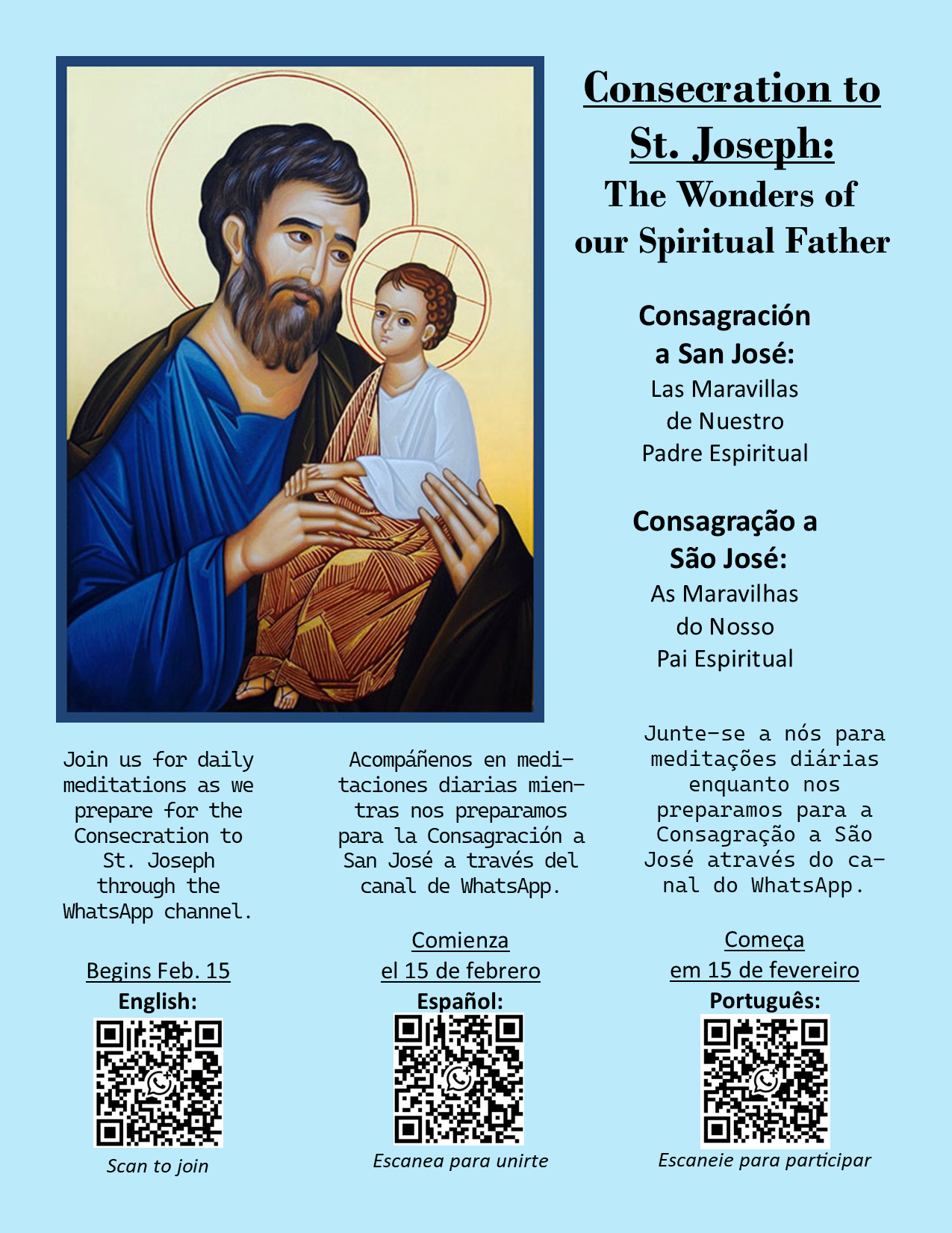 You are invited to prepare for the Consecration to St. Joseph by joining the WhatsApp channels, where daily reflections based on Consecration to St. Joseph: The Wonders of Our Spiritual Father will be shared starting February 15. Simply scan the QR code for the language of your preference: English, Spanish, or Portuguese.