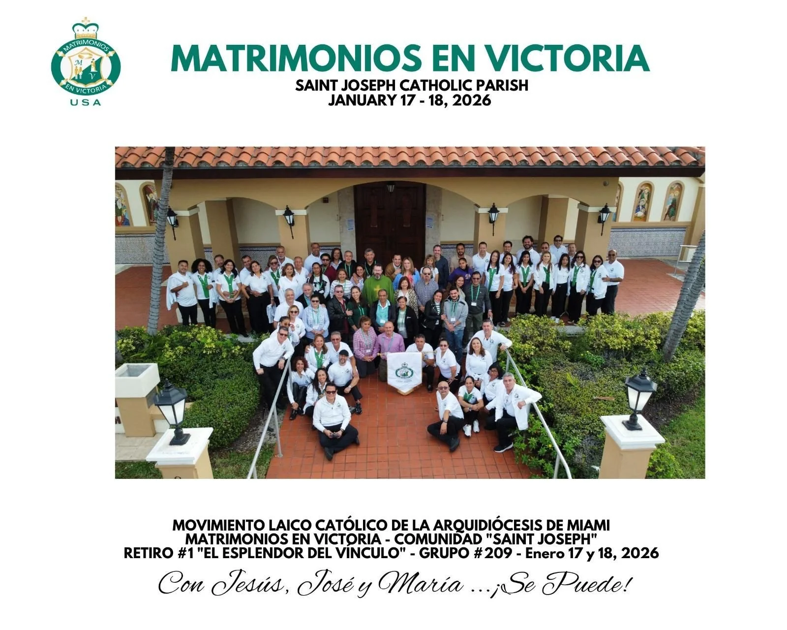Matrimonios en Victoria es un ministerio laico de la Iglesia Católica dedicado a fortalecer el matrimonio y la familia, ayudando a los esposos a crecer en su fe, en su amor mutuo y en su compromiso con Dios. A través de encuentros, oración, formación y retiros, el ministerio acompaña a los matrimonios para que vivan su vocación con esperanza, unidad y perseverancia, poniendo a Cristo en el centro de su vida familiar.